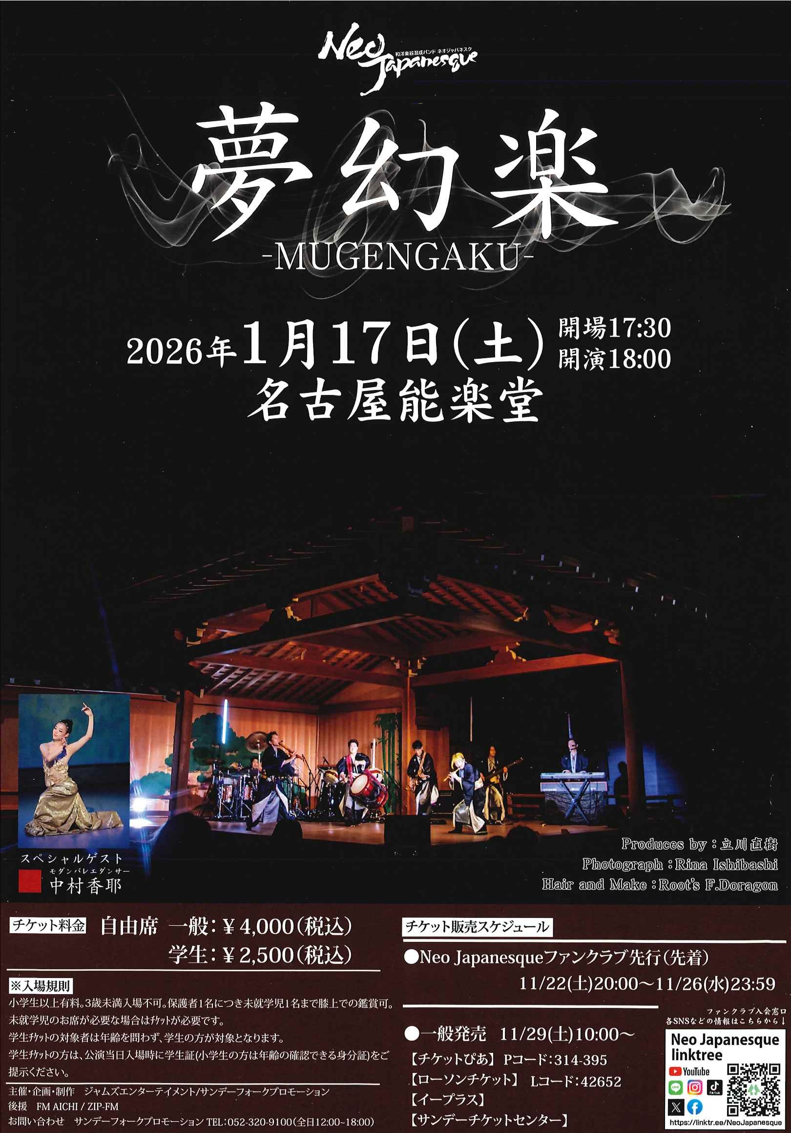 2026年 出演履歴 2025.09.262026.03.26 2026年 『夢幻楽 ーMUGENGAKUー』 2026年1月17日(土) 名古屋能楽堂 『カナザワ ダンス シアター2026』 2026年3月7日(土) 金沢21世紀美術館シアター21 ※ チラシをクリックすると拡大画面でご覧いただけます。